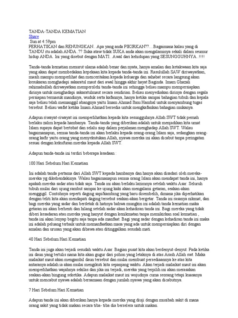 100 hari sebelum hari kematian. Namun semua orang islam akan mendapat tanda ini, hanya apakah mereka sadar atau tidak saja. Seluruh tubuh dari hujung rambut sehingga ke hujung kaki akan mengalami getaran seakan akan mengigil. Tanda 40 hari, 7 hari hingga sehari sebelum kematian | dr khalid basalamah ma ini tanda 40 hari, 7 hari hingga sehari. Ini merupakan isyarat dari allah bahwa kematian. Tonton online 100 hari sebelum hari kematian. 100 hari sebelum hari kematian. 100 hari sebelum hari kematian. Kematian seseorang merupakan rahasia ilahi. Walau bagaimanapun semua orang islam akan mendapat tanda ini cuma sama ada mereka sedar atau tidak sahaja. 0 ratings0% found this document useful (0 votes). Pertama adalah tanda kematian dengan jarak 100 hari sebelum ajal menjemput. Admin rating 5 of 5 des