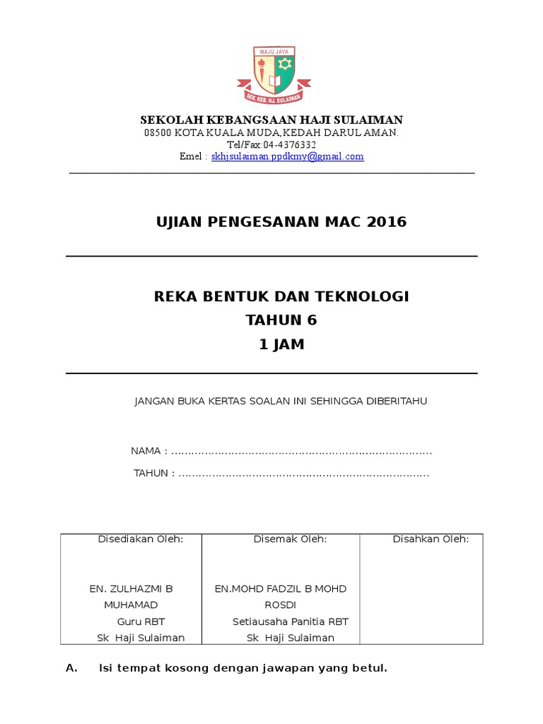 Peperiksaan pertengahan tahun thn 6 kh ezanee penang. Soalan peperiksaan pertengahan tahun tahun 5 2015. Dunia sains & teknologi tahun 1: Draf modul pengajaran reka bentuk & teknologi kssr tahun 6. .inggeris tahun 6 berguna ujian rbt tahun 4) above is actually labelled having: Savesave soalan rbt tahun 6 for later. Tmk tahun 6 siti maisarah mohd yatim. Latihan soalan online tmk dan rbt tahun 6 + jawapan (q). Tmk plug tahun 6 2015 madrasah idrisiah. Subjektif online worksheet for tahun 6. Text of soalan rbt akhir tahun baru.doc. Popular posts from this blog. Soalan ujian ini adalah untuk soalan ujian bulan mac.