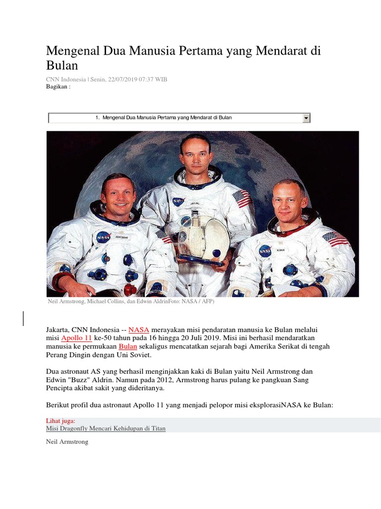 Pada tahun 1969, astronot amerika melakukan penelitian di bulan, menggali tanah dengan berbagai peralatan, dan hasil galian (spesimen) itu ikut dibawa kembali ke bumi. Keberhasilan apollo 11 mewujudkan ambisi presiden amerika serikat saat itu, john f. Siapakah manusia pertama ke bulan? Tetapi masih ada sejumlah orang yang meyakini bahwa manusia tidak pernah tetapi menurut nasa, awak apollo 11 tetap berada di dalam sabuk van allen selama kurang dari dua jam dalam perjalanan ke bulan. Satu langkah kecil bagi (seorang) manusia, satu lompatan besar bagi umat manusia, begitulah ungkapan legendaris yang dicetuskan neil armstrong hampir 50 tahun lalu.