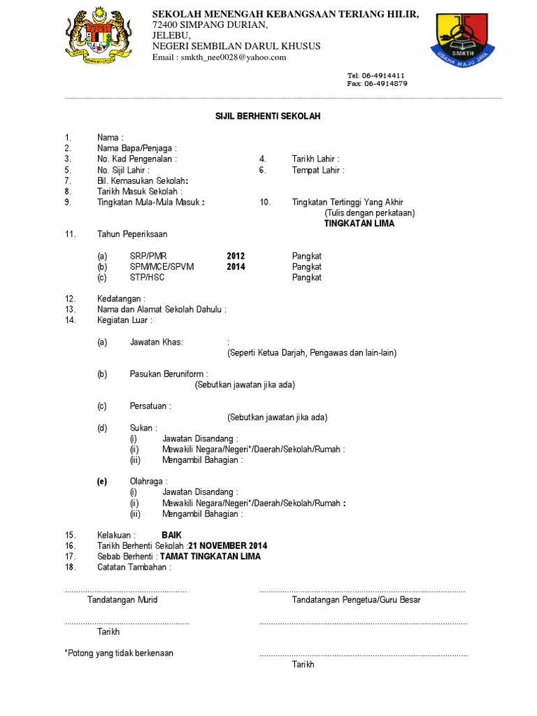 2 from T6bcp ini adalah untuk calon persendirian, sekolah swasta dan sekolah menengah agama negeri yang memohon memasuki tingkatan enam tahun 2017 di sekolah menengah bantuan penuh kerajaan. Tamat tingkatan 5 kehadiran tahun 2016. Download draf sijil berhenti sekolah. Sekolah menengah agama nilai, 71800 nilai, negeri sembilan no. Aku nak share apa korang nak buat sijil berhenti sekolah kalau korang kehilangan sijil berhenti sekolah tu. Primary school, former students sijil berhenti sekolah menengah. Mengurus koleksi kertas soalan ujian, peperiksaan dalaman dan luaran. Ged, yang sering disebut sebagai sijil sekolah menengah, adalah ujian yang boleh anda ambil untuk menunjukkan kepada majikan bahawa anda mungkin kolej mencari pengakap!
